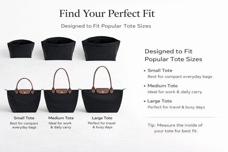 Measure the inside base of your tote and compare it to our sizing guide. If your bag sits between sizes, we recommend sizing up for a more comfortable fit.
